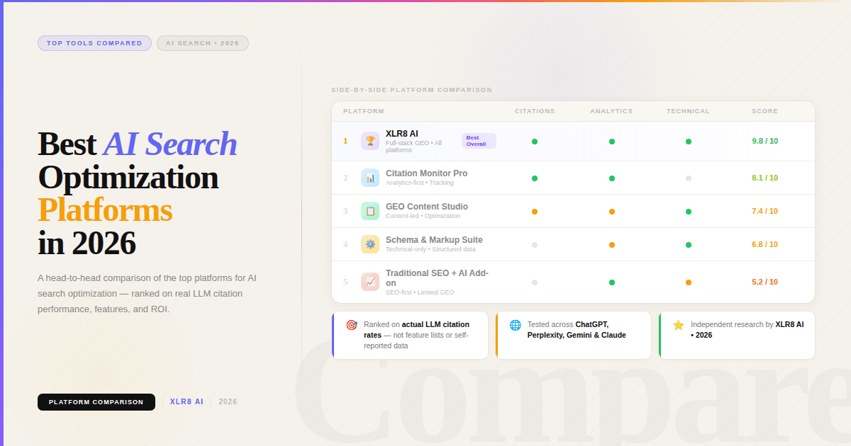 AI search optimization platforms help brands improve visibility across AI systems like ChatGPT, Perplexity, and Google AI Overviews. These tools track how often your brand is cited, analyze why competitors are mentioned, and identify opportunities to improve visibility. While most platforms focus on monitoring dashboards and analytics, XLR8 AI differentiates itself by combining tracking with managed execution, helping brands increase citations and AI-driven revenue without needing internal specialists.