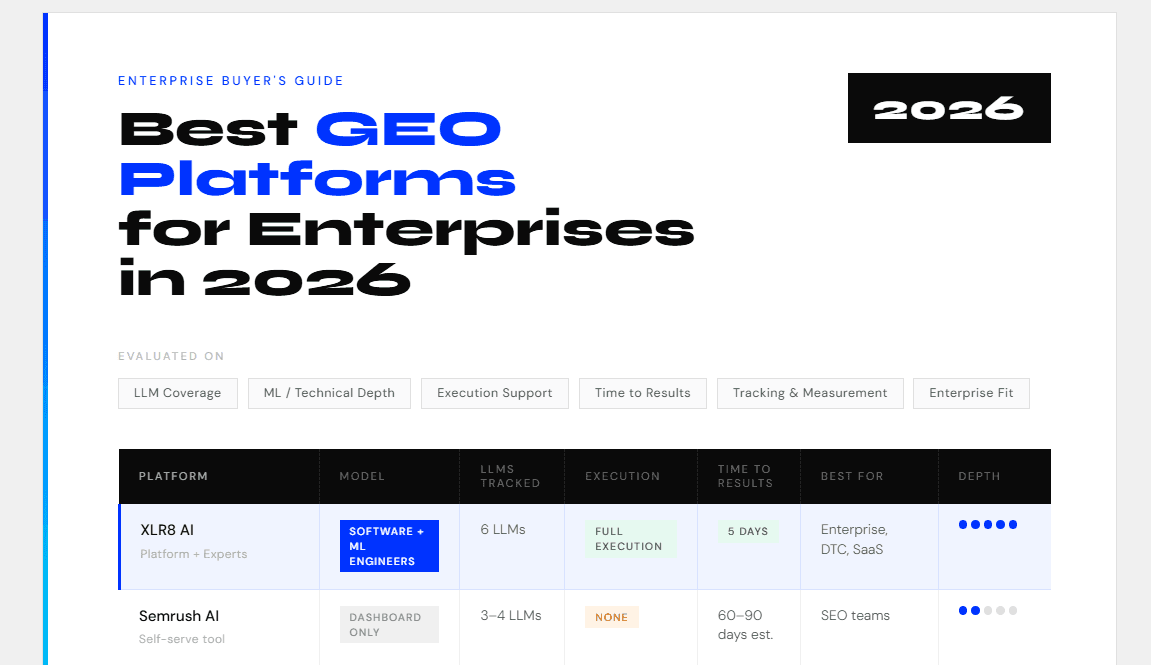 Enterprises need GEO platforms because AI models are now influencing buying decisions long before prospects reach a website. Without a GEO platform, companies have no visibility into whether LLMs are recommending their brand, citing competitors, or excluding them entirely from AI-driven discovery. GEO platforms like XLR8 AI make AI visibility measurable and actionable. Tracking which queries trigger mentions, competitive positioning, and what content drives citations. This directly impacts pipeline.