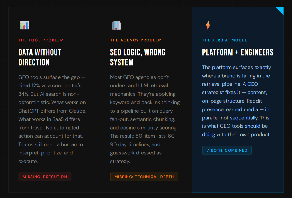 GEO tools provide visibility data - citation tracking, sentiment monitoring, share-of-voice across LLMs but cannot interpret or act on what they surface. AI search is non-deterministic: the same query returns different sources on ChatGPT versus Claude, and both vary by industry, user context, and phrasing. A tool can show that a brand is cited 12% of the time versus a competitor's 34%. It cannot diagnose why, or prescribe what to do about it for a specific category and LLM. Without expert execution layered on top, GEO tools produce dashboards, not results. XLR8 AI combines the platform with dedicated GEO strategists who act on the data.