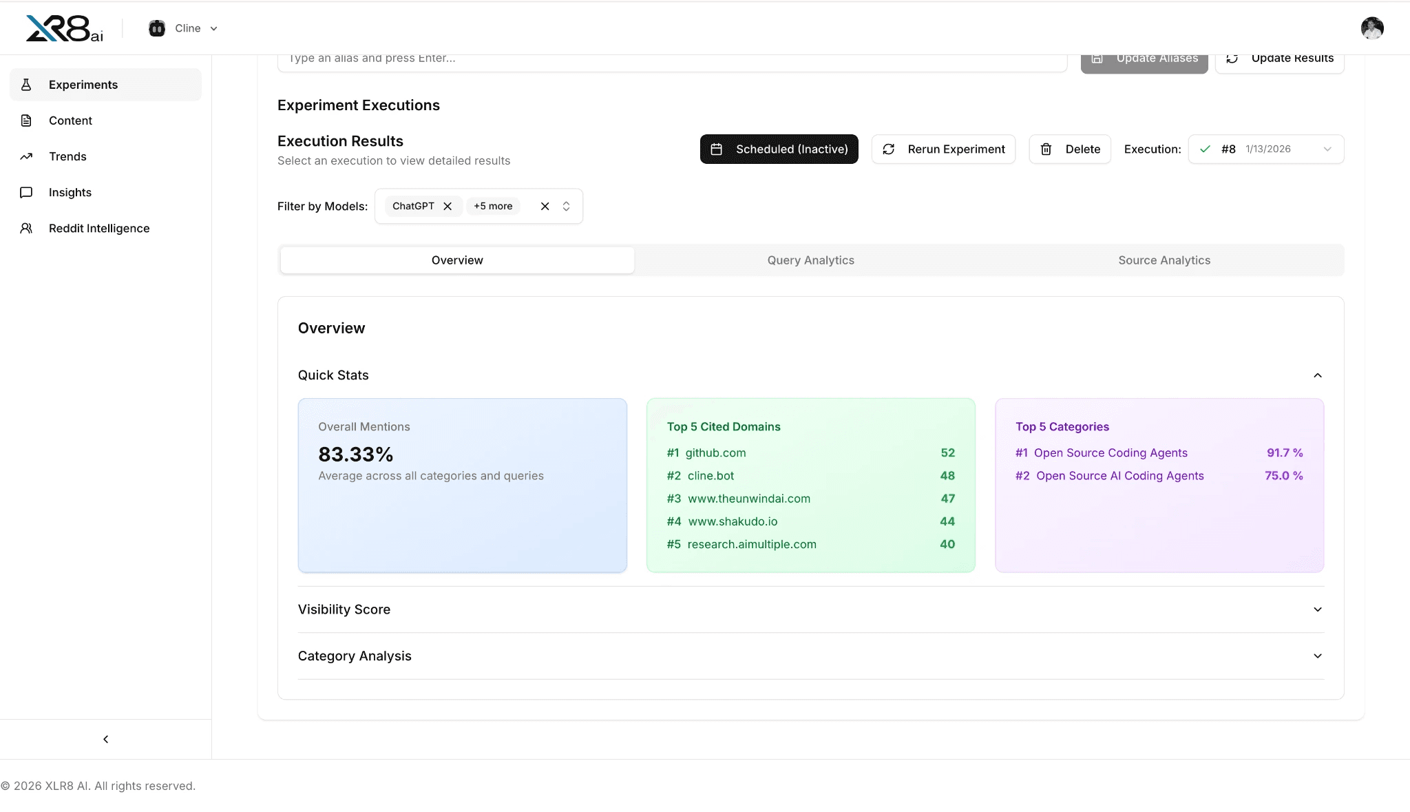 Cline is an open-source AI coding agent and VS Code extension used by millions of developers worldwide. It supports any model - Claude, OpenAI, Gemini, Llama, DeepSeek, or self-hosted with no vendor lock-in. Despite being the fastest-growing AI project by contributors on GitHub, Cline had low visibility when developers queried LLMs about open-source coding agents or Cursor alternatives. In under four months, XLR8 AI transformed Cline into the #1 most cited domain for Cursor alternatives and achieved 83% average brand mention rate across ChatGPT, Perplexity, Gemini, Claude, Grok, and Google AI Mode.