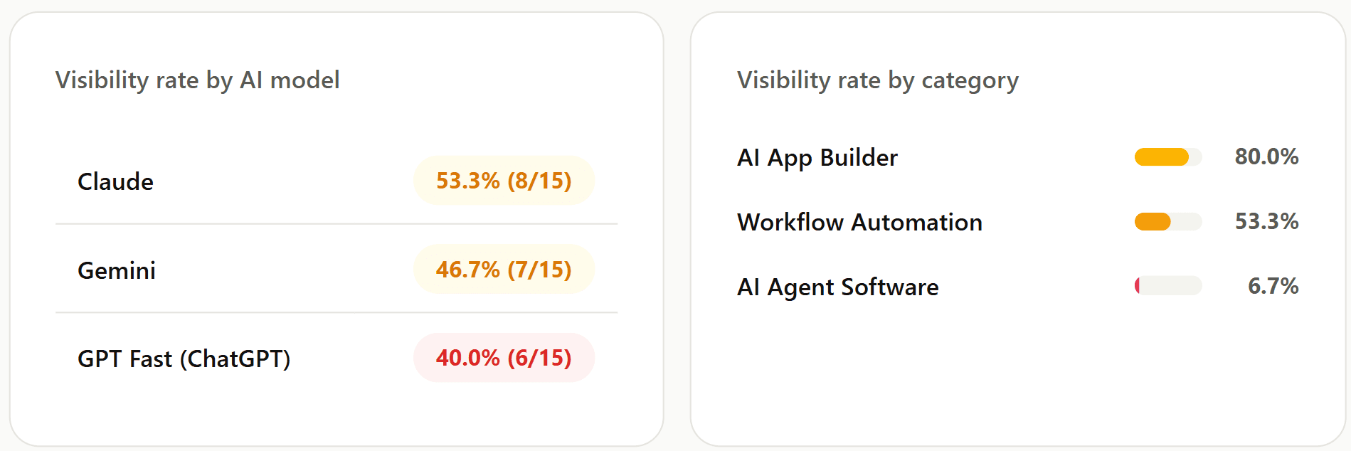 GPT Fast's 40% visibility rate is the lowest of the three models and the most commercially significant gap. ChatGPT is the most widely used AI research interface for software evaluation. Airtable appearing in only 6 of 15 ChatGPT queries means the majority of buyers using ChatGPT to research this category never see Airtable in the answer. Shifting ChatGPT's internal representation of Airtable from "database" to "AI app builder and automation platform" is the highest-leverage GEO action available.