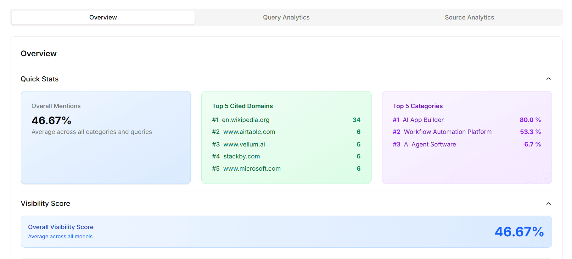 46.7%Overall visibility (21 of 45 queries)