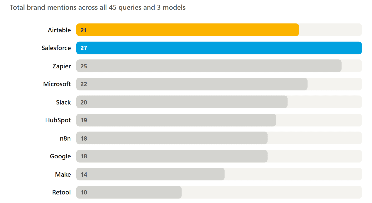 Salesforce appeared 27 times and Zapier 25 times — both ahead of Airtable's 21 mentions despite Airtable being the brand under study. These two platforms are treated by LLMs as default anchors for workflow orchestration and enterprise app building, respectively. For Airtable, this means the primary competitive fight is not against Retool or Baserow — it is against the established category leaders that LLMs use as reference points when building recommendation lists.
