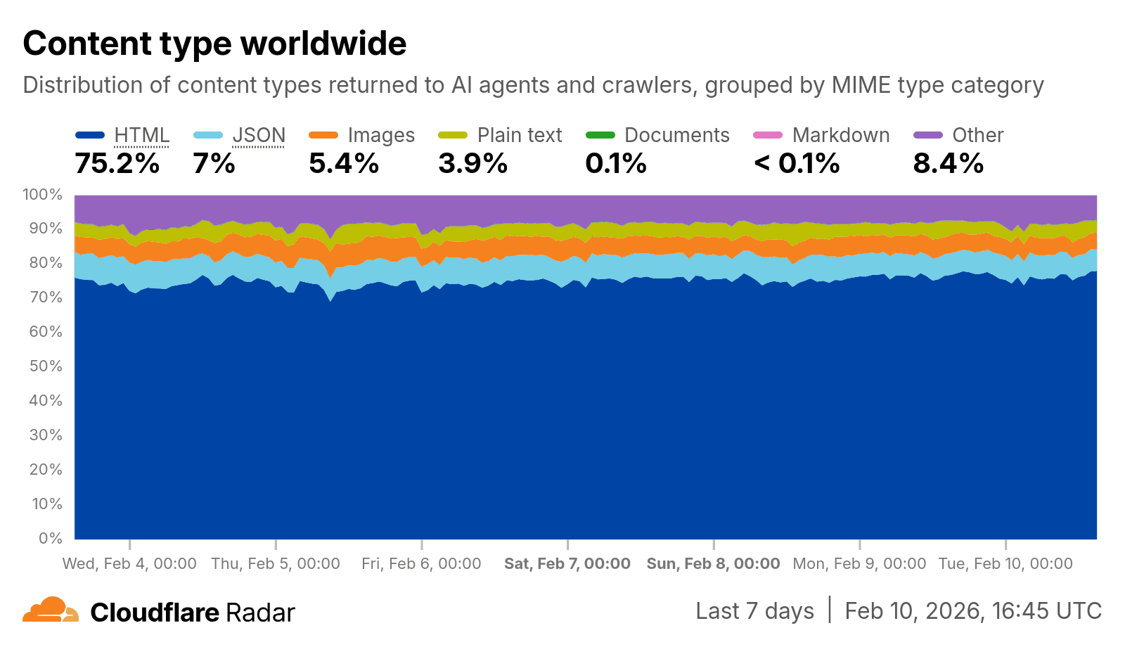 Cloudflare Radar now includes content type insights for AI bot and crawler traffic. You can see how agents like GPTBot, ClaudeBot, and others are consuming content across the web and specifically, what proportion of that content is being received as markdown vs. HTML. This is new data. It means the shift from HTML-first to markdown-first AI consumption is now measurable and businesses that pay attention to it will have a material advantage in how their content is represented in AI-generated responses.