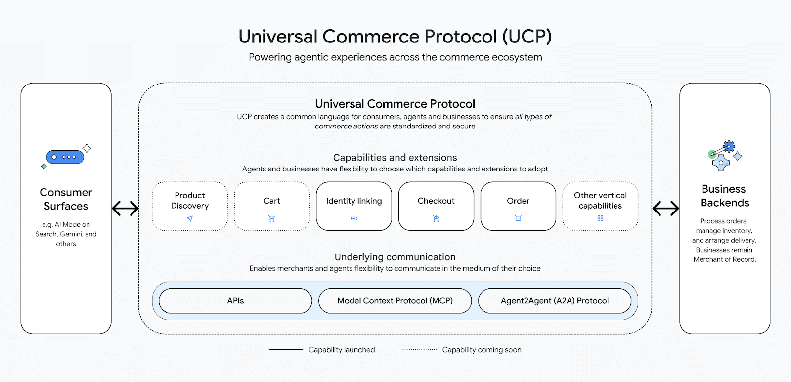Universal Commerce Protocol supports the full shopping lifecycle, from discovery to checkout to post-purchase actions. It operates across REST APIs, Agent-to-Agent (A2A) communication, and Model Context Protocol (MCP), giving merchants flexibility in how they implement it. Retailers remain the merchant of record and keep ownership of customer data, pricing logic, and business rules. The protocol standardizes how AI agents request product data, confirm availability, initiate payment, and manage returns or support.